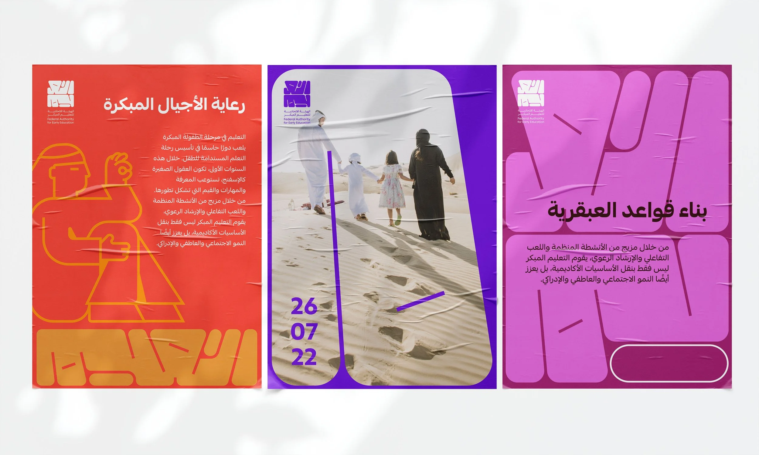 The branding direction created for the Federal Authority for Early Education of Abu Dhabi revolves around the creation of a personalized display typeface, with dynamic organic letters in Arabic and Latin scripts that transform to fit various blocks. Paired with illustrations that mimic their shapes, this design embodies the Authority's commitment to innovative and inclusive learning experiences, making it a powerful representation of their vision for early education in Abu Dhabi.